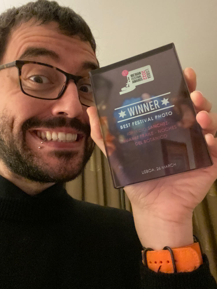 Ha pasado mucho tiempo, ¿no? Que si una pandemia, el nacimiento de mi hijo, el dejar mi trabajo de casi toda la vida en Sálvame para ir saltando cada pocos meses de proyecto en proyecto… y entre tantas cosas incluso me ha dado tiempo a ganar un premio, jajaja. En 2022 me llevé el Iberian Festival Awards a la mejor fotografía de concierto de España y Portugal por una del concierto de María José Llergo en Noches del Botánico. Encima luego premiaron al festival y como no fue nadie me sacaron a mí a recoger su premio. Fue gracioso.